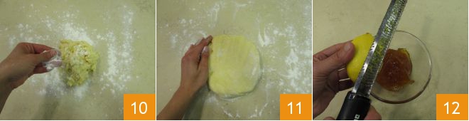 A questo punto infarinate leggermente il piano e trasferite la frolla, aiutandovi con la marisa. Aggiungete sopra ancora un po' di farina 10 e senza impastare compattatela in modo da formare un panetto. Avvolgete nella pellicola 11 e riponete in frigorifero a rassodare, possibilmente per tutta la notte. In questo modo la pasta si stabilizzerà e sarà molto più facile lavorarla. Potrete poi passare alla composizione della crostata. Versate la confettura in una ciotola, aggiungete la scorza del limone 12