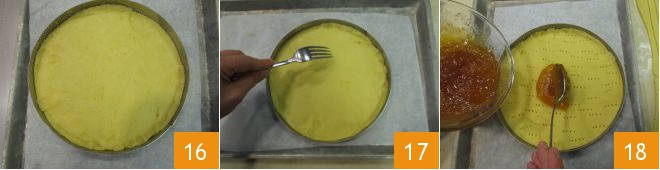 Posizionate l'anello su una leccarda foderata con carta forno, trasferite il disco di pasta all'interno 16 e bucherellate la base con i rebbi di una forchetta 17. Versate la confettura al centro del disco di frolla e stendetela con il dorso di un cucchiaio 18, lasciando circa 1 cm dal bordo.