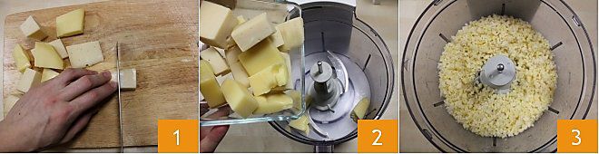 Um den Makkaroni-Käse herzustellen, schneiden Sie zuerst alle Käsesorten ohne Rinde in Stücke 1; Geben Sie sie in einen Mixer 2 (wenn Sie keinen haben, reiben Sie sie von Hand) und zerkleinern Sie sie 3.