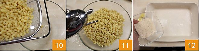 Gießen Sie die Makkaroni sehr al dente ab, etwa zwei Minuten vor dem angegebenen Ende, geben Sie sie in eine Schüssel 10 und beträufeln Sie sie mit etwas Öl 11, dann mischen Sie, damit die Pasta nicht klebt. Nachdem dies erledigt ist, buttern Sie eine große Auflaufform gut ein und bedecken Sie den Boden und die Seiten mit Semmelbröseln 12.