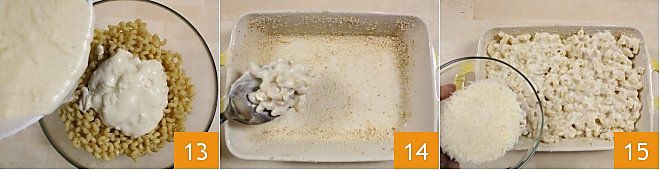 Vermischen Sie die Käsecreme mit der Pasta und mischen Sie gut 13. Geben Sie die Pasta in die Auflaufform 14, bestreuen Sie die Oberfläche mit geriebenem Parmesan 15 und backen Sie den Makkaroni-Käse in einem vorgeheizten statischen Ofen etwa eine halbe Stunde bei 180°C (Umluft 160°C für 20-25 Minuten) und backen Sie weitere 15 Minuten im Grillmodus, um eine goldene und knusprige Kruste zu erhalten. Sobald sie fertig sind, nehmen Sie die Auflaufform aus dem Ofen und servieren Sie Ihren Makkaroni-Käse heiß.