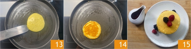 Backen Sie die Pfannkuchen bei mittlerer Hitze für ein paar Minuten. Wenn die ersten Bläschen erscheinen, wenden Sie den Pfannkuchen vorsichtig mit einem Spatel 13 und backen Sie ihn auch auf der anderen Seite goldbraun 14. Legen Sie die fertigen Pfannkuchen nach und nach auf einen Teller, ohne sie übereinander zu stapeln, damit sie nicht zusammenfallen. Wenn alle Pfannkuchen fertig sind, können Sie sie stapeln und mit reichlich Ahornsirup servieren 15!
