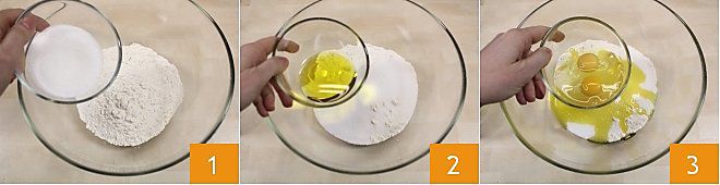 Um die abruzzischen Soffioni zuzubereiten, denken Sie daran, den Schafskäse in ein feines Sieb zu legen und ihn mindestens 2 Stunden abtropfen zu lassen, damit er seine Molke verliert. Widmen Sie sich dann der Zubereitung des Teigs: Nehmen Sie eine große Schüssel und geben Sie das Mehl hinein, zu dem Sie den Zucker 1, das Öl 2 und die Eier plus das Eigelb 3 hinzufügen werden.