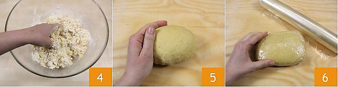 Kneten Sie 4, bis Sie einen glatten und festen Teigball erhalten 5, der eine ähnliche Konsistenz wie Nudelteig hat und wickeln Sie ihn in Frischhaltefolie ein und lassen Sie ihn bei Raumtemperatur etwa 30 Minuten ruhen 6, während Sie die Füllung vorbereiten.