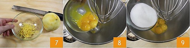 In der Zwischenzeit bereiten Sie die Creme zu: Reiben Sie die Schale einer Zitrone ab und legen Sie sie beiseite in eine kleine Schüssel 7. Trennen Sie dann die Eigelbe von den Eiweißen, geben Sie sie in die Schüssel einer Küchenmaschine 8, fügen Sie den Zucker hinzu 9 und schalten Sie ein, bis Sie eine helle und schaumige Mischung erhalten. Wenn Sie keine Küchenmaschine besitzen, können Sie einen elektrischen Mixer oder einen Schneebesen verwenden.
