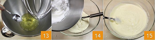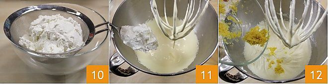 Sieben Sie zu diesem Zeitpunkt den Ricotta, den Sie zum Abtropfen gestellt hatten, mit Hilfe der Rückseite eines Löffels 10 und fügen Sie ihn der schaumigen Mischung hinzu 11. Schließlich fügen Sie auch die abgeriebene Zitronenschale hinzu, die Sie beiseite gelegt hatten 12, mischen Sie und geben Sie alles in eine Schüssel. Denken Sie daran, nicht zu lange zu mischen, da sonst der Ricotta aufgeschlagen wird.