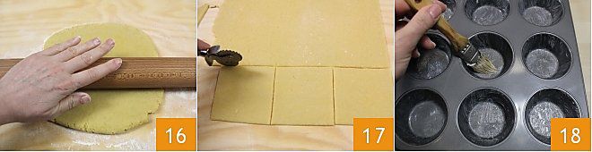Rollen Sie nun den Teig aus, bis er eine Dicke von etwa 3 mm erreicht 16. Teilen Sie den Teig in 12 Quadrate, die 10x10 cm groß sind 17 und fetten Sie eine Muffinform mit Butter ein, indem Sie einen Pinsel verwenden 18. Wenn Sie keine Muffinform haben, können Sie die Einweg-Aluminiumschalen verwenden, die Sie in allen Supermärkten finden.
