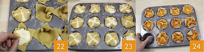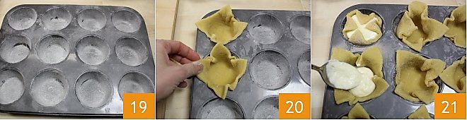 Nachdem Sie die Form eingefettet haben, stäuben Sie sie leicht mit Mehl 19 und beginnen Sie, die Teigquadrate in die Felder zu setzen, wobei Sie darauf achten, die Ränder herausragen zu lassen 20. Gießen Sie dann etwa 60 g Creme in jedes Teigquadrat 21.