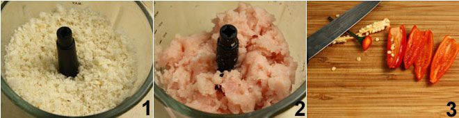 Um die aromatischen Hähnchensticks zuzubereiten, beginnen Sie damit, das Brot im Mixer zu zerkleinern 1 und separat 400 g Hähnchenbrust 2, legen Sie beides zur Seite. Entfernen Sie dann die Samen aus den frischen Chilischoten 3