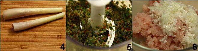 und schälen und entfernen Sie die Enden der Zitronengrasstängel 4. Hacken Sie sie fein in einem Mixer zusammen mit dem Ingwer und den Blättern von Minze und Koriander 5. Waschen Sie die Frühlingszwiebeln und schneiden Sie sie fein mit einem scharfen Messer. Geben Sie das gehackte Hähnchen in eine Schüssel und fügen Sie die Frühlingszwiebeln hinzu 6,
