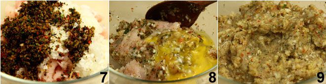 die Gewürz- und Aromamischung 7, das Ei, das Sie vorher verquirlt haben 8, und das im Mixer zerkleinerte Brot. Vermengen Sie die Zutaten gut 9 und schmecken Sie sie schließlich mit Salz ab.