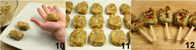 Mit nassen Händen (halten Sie eine Schale mit warmem Wasser bereit) formen Sie kleine Zylinder aus der Masse, legen Sie diese auf einen Teller und drücken Sie sie leicht mit den Fingern flach 10, um die Form von kleinen Ziegeln zu erhalten. Legen Sie die Stäbchen für 10/15 Minuten in den Kühlschrank 11. Erhitzen Sie eine Grillpfanne/Platte bei mittlerer Hitze, legen Sie die Hähnchensticks darauf und braten Sie sie etwa 10 Minuten, drehen Sie sie häufig, um ein Anhaften zu vermeiden. Eventuell die Platte leicht mit Öl einfetten. Servieren Sie die aromatischen Hähnchensticks mit Spießchen 12 als Aperitif, begleitet von einer Joghurtsauce, Sojasauce oder süßer Chilisauce.