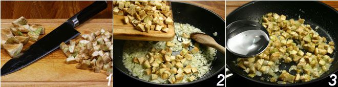 Beginnen Sie mit der Reinigung der Artischocken: Entfernen Sie die äußeren härteren Blätter; sobald Sie das Herz erreicht haben, schneiden Sie es in 4 Teile und legen Sie alle gewonnenen Stücke in eine Lösung aus Wasser und Zitronensaft. Schälen und hacken Sie eine Zwiebel und braten Sie sie in einem Topf mit 3 Esslöffeln Olivenöl an; lassen Sie die Artischocken abtropfen und schneiden Sie sie in kleine Quadrate 1, dann fügen Sie sie 2 zur Zwiebel hinzu und lassen Sie sie bei niedriger Hitze etwa 15-20 Minuten kochen, indem Sie sie mit einem Deckel abdecken und bei Bedarf Gemüsebrühe (oder heißes Wasser) hinzufügen 3.