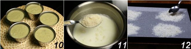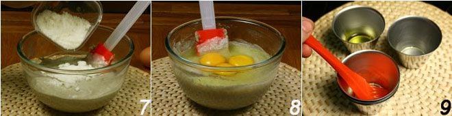 und fügen Sie auch 30 g geriebenen Parmesan 7 und die 3 Eier 8 hinzu. Ölen Sie 5 Förmchen (vom Typ für Crème Caramel)9