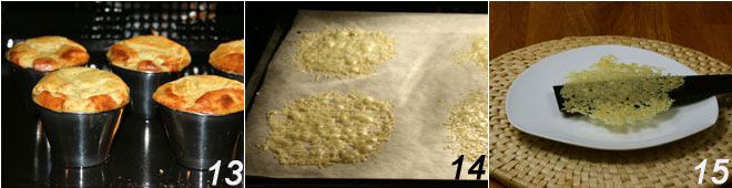 und füllen Sie sie, indem Sie die Artischockenmischung verteilen 10. Backen Sie die Artischockenflans etwa 35-40 Minuten in einem vorgeheizten Ofen bei 180°. In der Zwischenzeit bereiten Sie die Parmesansauce vor, indem Sie die Sahne in einem kleinen Topf erhitzen, bis sie fast kocht; dann fügen Sie den Parmesan hinzu 11 und rühren, bis er schmilzt. Beenden Sie, indem Sie Salz und Pfeffer nach Bedarf hinzufügen. Zu diesem Zeitpunkt bereiten Sie auch die Parmesanwaffeln vor: Legen Sie ein Backblech mit Backpapier aus, dann verteilen Sie auf der Oberfläche 5 Esslöffel geriebenen Käse und formen Sie 5 Kreise 12 mit einem Durchmesser von etwa 10 cm.