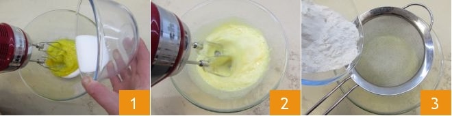 Um die leckeren Küsschen vorzubereiten, beginnen Sie mit dem Teig für die Hüllen. Nehmen Sie eine große Schüssel (wenn Sie möchten, können Sie auch eine Küchenmaschine verwenden), in die Sie die Eier bei Raumtemperatur geben und den Zucker nach und nach hinzufügen 1. Schalten Sie die elektrischen Rührgeräte auf mittlerer Geschwindigkeit ein, bis Sie eine helle und schaumige Masse erhalten: Das dauert etwa 10 Minuten 2. Wenn die Masse fertig ist, sieben Sie das Mehl hinein 3.