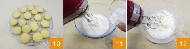 Nach der Backzeit können Sie sie aus dem Ofen nehmen und auf einem Gitter abkühlen lassen 10. Während die Hüllen abkühlen, widmen Sie sich der Füllung, beginnend mit der geschlagenen Sahne: Nehmen Sie eine saubere Schüssel, geben Sie die kalte frische Sahne aus dem Kühlschrank hinein und schlagen Sie mit sauberen elektrischen Rührgeräten, fügen Sie nach und nach den Puderzucker hinzu 11, und schlagen Sie weiter, bis die Sahne schön schaumig ist 12 (für ein Detail zu diesem Vorgang folgen Sie unserer Kochschule: Wie man Sahne schlägt). Geben Sie die geschlagene Sahne in einen Spritzbeutel mit Sterntülle und die Marmelade in einen anderen Spritzbeutel mit glatter Tülle (wenn Sie keine Tüllen haben, können Sie auch zwei Einweg-Spritzbeutel verwenden und einfach die Spitze abschneiden).