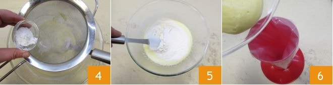 Sieben Sie auch das Backpulver in die Schüssel 4 und rühren Sie es vorsichtig mit einem Spatel unter die anderen Zutaten 5: Sie sollten sanfte Bewegungen von unten nach oben ausführen, um die gesiebten Zutaten einzubinden, ohne die Masse zu entlüften. Wenn die Zutaten gut vermischt sind, geben Sie die Masse in einen Spritzbeutel 6.
