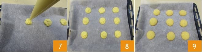 Nun legen Sie ein Backblech mit Backpapier aus und formen Sie kleine Teigscheiben von etwa 3 cm Durchmesser 7, wobei Sie darauf achten, sie gut auseinander zu legen. Sie sollten 20 Scheiben erhalten 8, die Sie im vorgeheizten statischen Ofen bei 190°C für 12 Minuten backen (wir empfehlen nicht die Verwendung eines Umluftofens): Die Kekse sollten leicht aufgehen und eine leicht goldene Farbe annehmen 9.