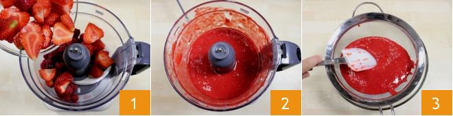 Um die Baisers mit roten Früchten zuzubereiten, beginnt mit der Reinigung der Früchte. Spült Himbeeren und Erdbeeren unter fließendem Wasser ab, entfernt dann die grünen Blätter von den Erdbeeren mit einem Messer und halbiert sie. Dann gebt die Himbeeren und Erdbeeren in den Mixer 1 und püriert die Früchte, bis ihr ein gleichmäßiges Fruchtpüree erhaltet 3. Dann filtert es durch ein feinmaschiges Sieb und helft euch mit einem Spatel oder Löffel, um das gesiebte Fruchtpüree in einer kleinen Schüssel zu sammeln 3. Das gesammelte Fruchtpüree sollte ein Gewicht von etwa 75 g haben.
