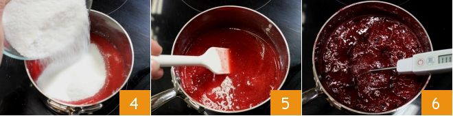 Gebt es dann in einen kleinen Topf, fügt 100 g Zucker hinzu 4 und zündet den Herd an, rührt um, um den Zucker zu schmelzen 5. Erhitzt das Fruchtpüree auf 121° 6 und überwacht die Temperatur mit einem Küchenthermometer. Wenn der Sirup 115° erreicht hat, beginnt die Eiweiße zu schlagen.