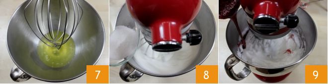 Gießt die Eiweiße in die Schüssel einer Küchenmaschine 7 und schaltet die Rührbesen ein (wenn ihr keine Küchenmaschine habt, könnt ihr auch einen elektrischen Handmixer verwenden). Wenn sie halb steif sind, fügt mit den immer noch laufenden Rührbesen 25 g Zucker hinzu 8. Schlagt weiter, um den Zucker einzuarbeiten, und wenn der Sirup 121° erreicht hat, fügt ihn in einem dünnen Strahl zu den geschlagenen Eiweißen hinzu 9, während die Rührbesen weiterlaufen, bis ihr eine schaumig gleichmäßige und vollständig kalte Masse erhaltet.