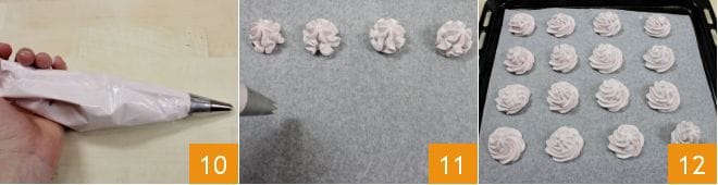 Wenn die Creme fertig ist, füllt sie in einen Spritzbeutel mit Sterntülle 10. Legt ein Backblech mit Backpapier aus und beginnt, Baisertuffs im Abstand von ein paar Zentimetern voneinander zu machen 11. Wenn ihr den ganzen Teig verwendet habt 12, backt bei 100° im statischen Ofen für 3 Stunden, bis die Baisers fest und leicht unterseitig gefärbt sind. Im Gegensatz zu der klassischen französischen Meringe bleibt dieses Baiser außen noch etwas weich und innen knusprig.