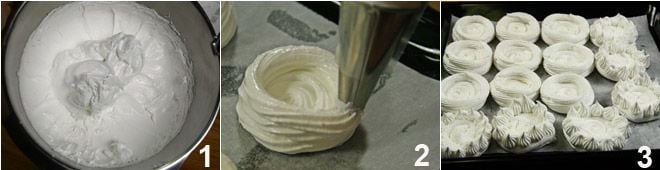Um ein gutes Baiser zuzubereiten, müssen Sie Eiweiß bei Raumtemperatur verwenden. Gehen Sie dann vor, indem Sie die Samen aus der Vanilleschote entnehmen und dem Zucker hinzufügen. Geben Sie das Eiweiß in die Schüssel eines Mixers (oder Sie können die Schneebesen eines Mixers verwenden) und schlagen Sie es steif; wenn das Eiweiß weiß zu werden beginnt, fügen Sie die Hälfte des Zuckers hinzu, schlagen Sie weitere 5-10 Minuten und fügen Sie dann den restlichen Zucker hinzu 1. Wenn das Baiser das fünffache seines ursprünglichen Volumens erreicht hat, geben Sie es in einen Spritzbeutel mit Sterntülle. Nehmen Sie ein Backblech und legen Sie es mit dem entsprechenden Papier aus und formen Sie dann die Nester, die einen Durchmesser von 4-5 cm haben sollten, indem Sie Spiralen mit dem Spritzbeutel formen (2-3).