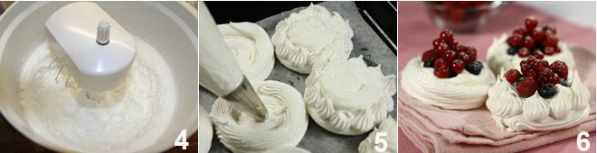Wir werden die so geformten Nester bei 80-100 Grad etwa 3 Stunden backen, wobei die Ofentür einen Spalt offen bleibt, indem man einen Holzlöffel zwischen die Tür und den Ofen klemmt, um Feuchtigkeit im Inneren zu verhindern. Gehen Sie dann vor und schlagen Sie die Sahne mit Hilfe eines Küchenroboters steif 4: wenn die Sahne anfängt, fest zu werden, fügen Sie den Puderzucker hinzu. Füllen Sie dann die Baisernester mit dem Spritzbeutel mit der Schlagsahne 5 und fügen Sie schließlich die Waldfrüchte hinzu und vollenden Sie Ihre wunderschönen Baisernester mit einer Prise Puderzucker 6.