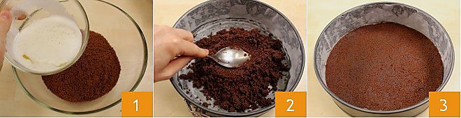 Um den Bananen-Schokoladen-Käsekuchen zuzubereiten, beginnen Sie mit dem Boden: Geben Sie die Kakaokekse in den Mixer und zerkleinern Sie sie fein. Lassen Sie die Butter bei niedriger Hitze in einem kleinen Topf schmelzen; in der Zwischenzeit geben Sie die zerkleinerten Kekse in eine Schüssel und fügen nach und nach die geschmolzene Butter hinzu, bis alles gut vermischt ist 1. Fetten Sie eine Springform mit einem Durchmesser von 22 cm ein; schneiden Sie eine Scheibe Backpapier mit dem gleichen Durchmesser wie die Form und zwei Streifen in der gleichen Höhe wie die Ränder. Bei Bedarf können Sie auf die Anleitung Wie man eine Springform mit Backpapier auskleidet zurückgreifen. Geben Sie dann die zerbröselten Kekse in die mit Backpapier ausgelegte Form und drücken Sie sie mit dem Rücken eines Löffels gut fest, um die Keksbasis zu verdichten 2. Lassen Sie den Boden 30 Minuten im Kühlschrank oder 15 Minuten im Gefrierschrank abkühlen 3.