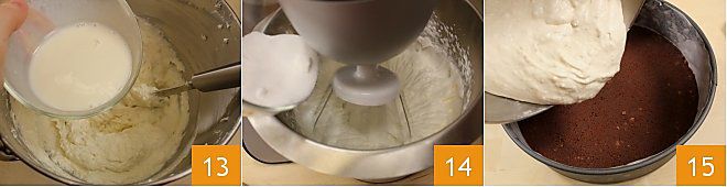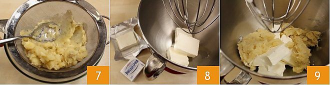Geben Sie nun die gekochten Bananen durch ein Sieb, um ein homogenes Püree zu erhalten, oder zerdrücken Sie sie mit einer Gabel 7. Geben Sie in eine Küchenmaschine oder eine große Schüssel den Frischkäse 8, fügen Sie das Bananenpüree 9 und schließlich 60 g Zucker hinzu.