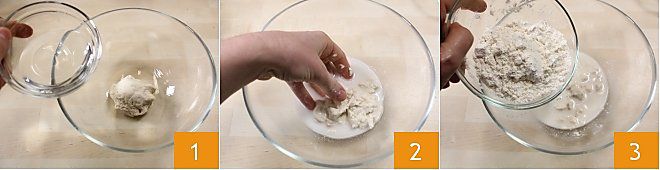 Um das cafone Brot zuzubereiten, müssen Sie 3 verschiedene Teige herstellen. Beginnen wir mit dem ersten: Nehmen Sie 70 g von Ihrem Sauerteig (hier das Rezept von GialloZafferano) oder besorgen Sie sich Sauerteig bei Ihrem vertrauenswürdigen Bäcker und geben Sie ihn zusammen mit dem Wasser in eine Schüssel 1. Lösen Sie den Teig mit den Händen auf 2, dann fügen Sie das Mehl 0 nach und nach hinzu 3 und