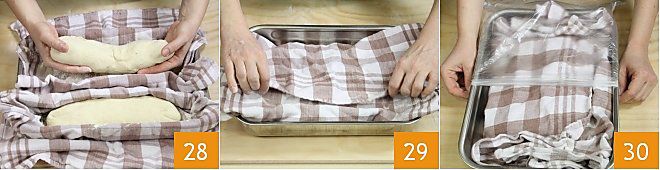 Legen Sie die Stangen jeweils auf ein Geschirrtuch 28, bestäuben Sie sie mit reichlich Hartweizengrieß und schließen Sie die Ränder der Geschirrtücher, um die Brote zu bedecken 29. Decken Sie das Blech locker mit Frischhaltefolie ab (nicht zu eng, sonst bleibt kein Platz für die Gärung) oder stecken Sie es in einen geräumigen Lebensmittelbeutel 30. Das cafone Brot muss 8-10 Stunden gehen.