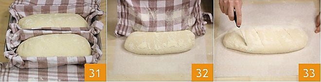Nach dieser Zeit sind die Stangen gut aufgegangen und bereit zum Backen 31. Heizen Sie den statischen Ofen auf 240° vor und lassen Sie das Backblech, auf dem die Stangen backen, im Inneren (es wird empfohlen, falls vorhanden, einen Backstein anstelle des Blechs auf den Boden des Ofens zu legen), das gut heiß sein muss. Wenn Sie einen Umluftofen haben, stellen Sie die Temperatur auf 220° ein. Heben Sie die Ränder des Geschirrtuchs an und kippen Sie eine Stange nach der anderen auf ein Backpapier 32: Berühren Sie das Brot nicht zu sehr, sonst fällt es zusammen! Machen Sie mit einem glatten und scharfen Messer diagonale Einschnitte 33. Sie können es auch ungeschnitten lassen, wenn Sie möchten.
