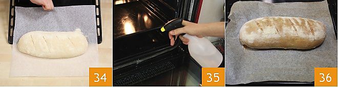 Lassen Sie das Backpapier auf das sehr heiße Blech gleiten 34 und bevor Sie das Brot backen, sprühen Sie mit einem Zerstäuber kaltes Wasser 3-4 Mal in den Ofen 35. Als Alternative zum Zerstäuber können Sie eine Schale mit 3-4 Eiswürfeln auf den Boden des Ofens stellen. Backen Sie das Brot und sprühen Sie nochmals 3-4 Mal Wasser. Backen Sie das Brot auf 1/3 der Höhe des Ofens (also ziemlich weit unten) und lassen Sie das Brot ca. 20 Minuten im statischen Ofen backen (im Umluftofen für 30 Minuten). Nach dieser Zeit senken Sie die Temperatur auf 200° (180° im Umluftofen) und backen Sie weitere 15-20 Minuten. Sobald es gebacken ist, nehmen Sie das Brot heraus und lassen Sie es auf einem Gitter abkühlen. Ihr cafone Brot ist fertig 36: Sie werden sehen, wie gut es schmeckt!