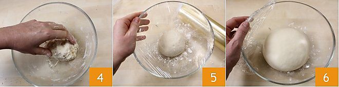 kneten Sie, bis Sie einen glatten und homogenen Teig erhalten haben, den Sie zu einer Kugel formen 4. Lassen Sie diesen ersten Teig mindestens 3 Stunden in der leicht bemehlten Schüssel, bedeckt mit Frischhaltefolie, im ausgeschalteten Ofen mit eingeschaltetem Licht gehen. Das Anfangsvolumen sollte sich nach dieser Zeit verdoppeln 6.