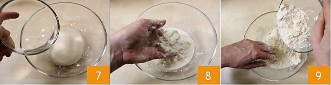 Jetzt ist es an der Zeit, mit dem zweiten Teig fortzufahren: In einer größeren Schüssel lösen Sie den vorherigen Teig mit weiteren 50 ml Wasser auf (7-8), fügen Sie das Mehl 0 hinzu 9 und