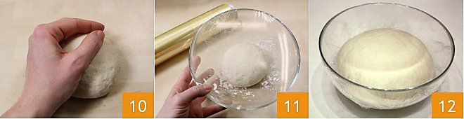 kneten Sie alles, wie zuvor 10. Lassen Sie auch den zweiten Teig mindestens 3 Stunden in einer Schüssel, bedeckt mit Frischhaltefolie, im ausgeschalteten Ofen mit eingeschaltetem Licht gehen 11. Wenn auch der zweite Teig gegangen ist 12, können Sie mit der Herstellung des Endteigs fortfahren.