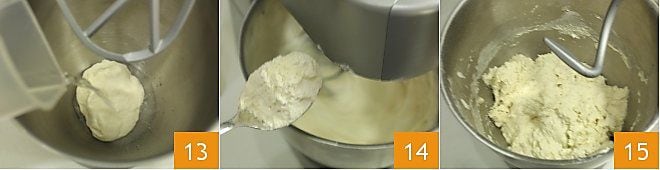 Geben Sie den gegangenen Teig in die Schüssel einer Küchenmaschine mit K-Haken (wenn Sie keine haben, können Sie von Hand kneten) und fügen Sie die Hälfte der 550 ml Wasser hinzu 13; schalten Sie die Maschine auf niedriger Geschwindigkeit ein, um den Teig aufzulösen, dann, sobald er aufgelöst ist, fügen Sie das Mehl nach und nach, einen Löffel auf einmal hinzu 14, abwechselnd mit dem restlichen Wasser, in dem Sie das Salz aufgelöst haben. Wenn sich die Zutaten um den K-Haken gesammelt haben, lösen Sie ihn und montieren Sie den Knethaken 15, mit dem Sie alles für mindestens 10 Minuten auf niedriger Geschwindigkeit kneten. Der Teig sollte sich um den Haken wickeln und sich von den Seiten der Schüssel lösen.