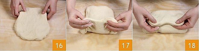 Geben Sie den weichen Teig auf die leicht bemehlte Arbeitsfläche: Sie müssen ihm Falten geben, um den Teig zu stärken, damit die Gärung nach oben wächst. Verlängern Sie den Teig mit den Händen leicht 16, indem Sie ihm eine rechteckige Form geben, dann falten Sie die erste Seite zur Mitte und machen Sie dasselbe mit der anderen, indem Sie sie überlappen (17-18).
