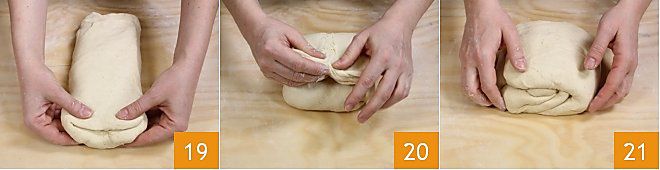 Drehen Sie den Teigling, verlängern Sie ihn ein wenig 19 und falten Sie ihn wie zuvor, indem Sie die Seiten zur Mitte falten (20-21). Lassen Sie den Teig 15-20 Minuten ruhen. Nach dieser Zeit geben Sie erneut Falten, wie bereits illustriert, und lassen Sie ihn weitere 15-20 Minuten ruhen.