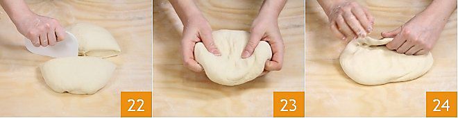 Zu diesem Zeitpunkt, wenn Sie zwei Laibchen erhalten möchten, teilen Sie den Teig in zwei gleiche Teile, mit denen Sie zwei Brote oder zwei Stangen formen können 22. Wenn Sie möchten, können Sie auch ein einziges Brot machen. Gehen Sie nun wie folgt für die Stangen vor: Kneten Sie ein Stück leicht, indem Sie die Seiten zur Mitte sammeln, drücken Sie es leicht flach 23 und rollen Sie den Teigling von einer Seite her auf 24, indem Sie mit den Fingern nach unten drücken und ihn bis zum Ende aufrollen. Wenn Sie stattdessen ein Brot möchten, falten Sie die beiden Enden der Stange darunter und runden den Teig ab.