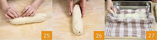 Drücken Sie mit den Fingern die obere Kante der Stange, um den Teig haften zu lassen 25. Hier ist das erste Laibchen fertig 26, gehen Sie auf die gleiche Weise auch mit dem zweiten Stück Teig vor. Nehmen Sie nun ein Backblech und bedecken Sie es mit zwei sauberen Geschirrtüchern, die nebeneinander und gut gefaltet sind, um eine Trennung in der Mitte zu schaffen, und bestreuen Sie sie gut mit Hartweizengrieß 27.