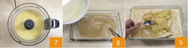 Pürieren Sie die Pfirsichscheiben, bis Sie eine glatte Masse erhalten 7. Übertragen Sie dann das Pfirsichpüree in ein breites, flaches Gefäß, um das Einfrieren zu erleichtern, und fügen Sie den mittlerweile kalten Sirup hinzu 8. Mischen Sie alles gut und stellen Sie es in den Gefrierschrank. Nach 30 Minuten brechen Sie die entstandenen Eiskristalle mit den Zinken einer Gabel auf 9.