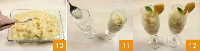 Wiederholen Sie diesen Vorgang drei weitere Male: Stellen Sie die Granita erneut in den Gefrierschrank und nehmen Sie sie alle 30 Minuten heraus, um die Mischung mit einer Gabel zu rühren, bis die Granitakonsistenz erreicht ist 10. Dann gießen Sie die Granita in die Sektgläser 11, dekorieren Sie mit ein paar Minzblättern und garnieren Sie das Glas mit Pfirsichscheiben 12, Ihre Bellini-Granita ist bereit zum Genießen!