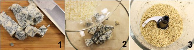 Um die Gorgonzola-Plätzchen zuzubereiten, beginnen Sie damit, den pikanten Gorgonzola in kleine Würfel zu schneiden 1 (Sie können auch Roquefort verwenden), geben Sie ihn dann in eine Schüssel und fügen Sie den geriebenen Parmesan hinzu 2. Hacken Sie die Walnüsse fein und legen Sie sie beiseite 3.