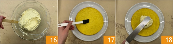Mischen Sie die beiden Massen mit einem Teigschaber mit Bewegungen von oben nach unten 16. Jetzt können Sie das Dessert zusammenstellen: Legen Sie eine Biskuit-Scheibe auf eine Servierplatte, befeuchten Sie sie mit der zuvor zubereiteten Tränke 17, verteilen Sie eine Schicht Creme 18.