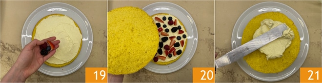 Legen Sie eine Schicht Waldfrüchte darauf 19, dann wieder Biskuit 20, Tränke und Creme 21.
