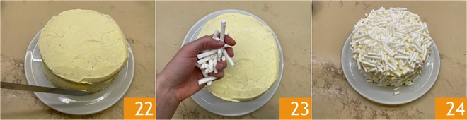 Sobald es aus der Form genommen und abgekühlt ist, entfernen Sie die Unregelmäßigkeiten an der Oberfläche 10, dann in 3 Scheiben teilen 11. Bereiten Sie die Tränke zu, indem Sie in einem kleinen Topf Wasser, Zucker und die Samen der Schote mischen 12, rühren und zum Kochen bringen, dann ausschalten und abkühlen lassen.