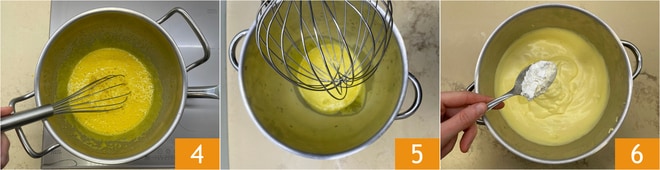 Sie müssen im Wasserbad erhitzen, um 45°C zu erreichen, zu messen mit einem Küchenthermometer 4. Vom Herd nehmen und gut mit einem elektrischen Mixer oder in der Küchenmaschine schlagen, bis es abgekühlt ist 5. Fügen Sie nun das zuvor gesiebte Mehl und die Speisestärke löffelweise hinzu, und mischen Sie von oben nach unten, um die Masse nicht zu entlüften 6.